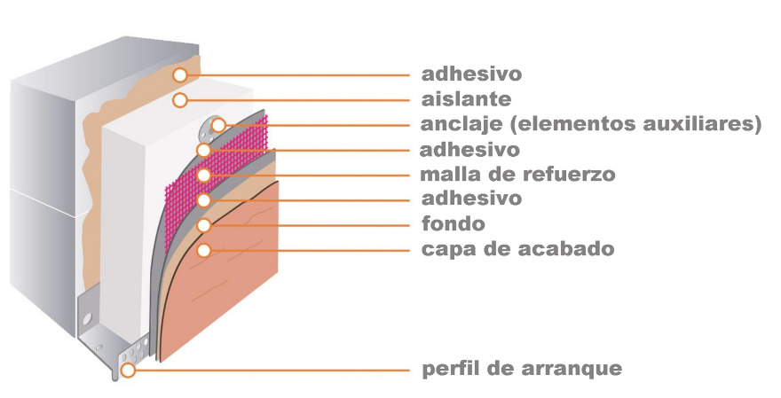El aislante se protege con un revestimiento constituido por varias capas de mortero, una de las cuales lleva una malla como refuerzo. El revestimiento se aplica directamente al panel aislante, sin intersticios de aire o capa discontinua.